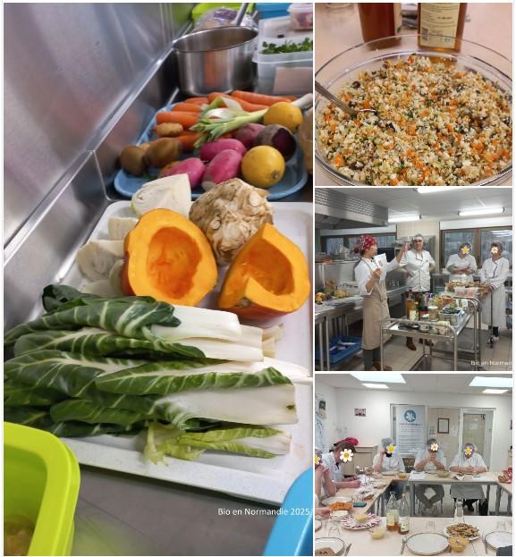 À Évreux, des cuisiniers de restauration collective du Département se forment avec le Collectif les Pieds dans le Plat et Bio en Normandie pour mieux nourrir nos enfants. Taboulé de chou-fleur, crème dessert grand-mère…