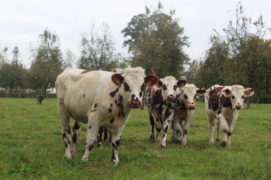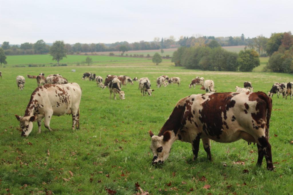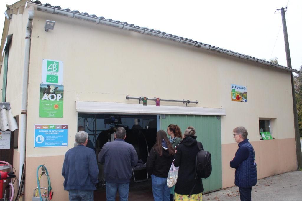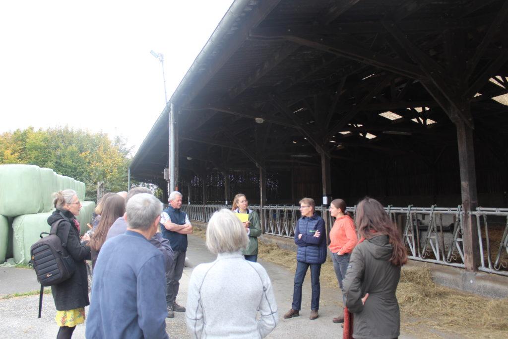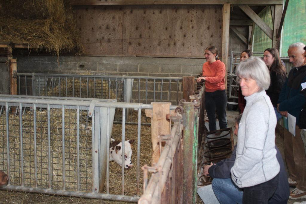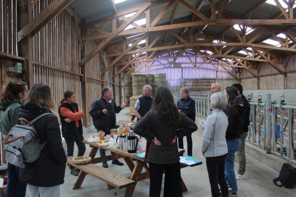La journée a démarré par la visite de la ferme du GAEC (groupement agricole d’exploitation en commun) Dubois. Ce fut l’occasion pour la famille Dubois de présenter leur système de production et d’expliquer les choix qu’ils ont fait : lait sous AOP (appellation d’origine protégée), conversion à l’agriculture biologique en 2017 avec passage au tout herbe (alimentation exclusivement à l’herbe et au foin). La ferme, de 80 hectares de prairies pour 60 vaches laitières, emploie 2 associées (Valentine er Maryline Dubois) et 1 salarié (Hervé Dubois). Le lait est collecté par la laiterie Gillot (Saint-Hilaire-de-Briouze) située à 15 km de la ferme.
